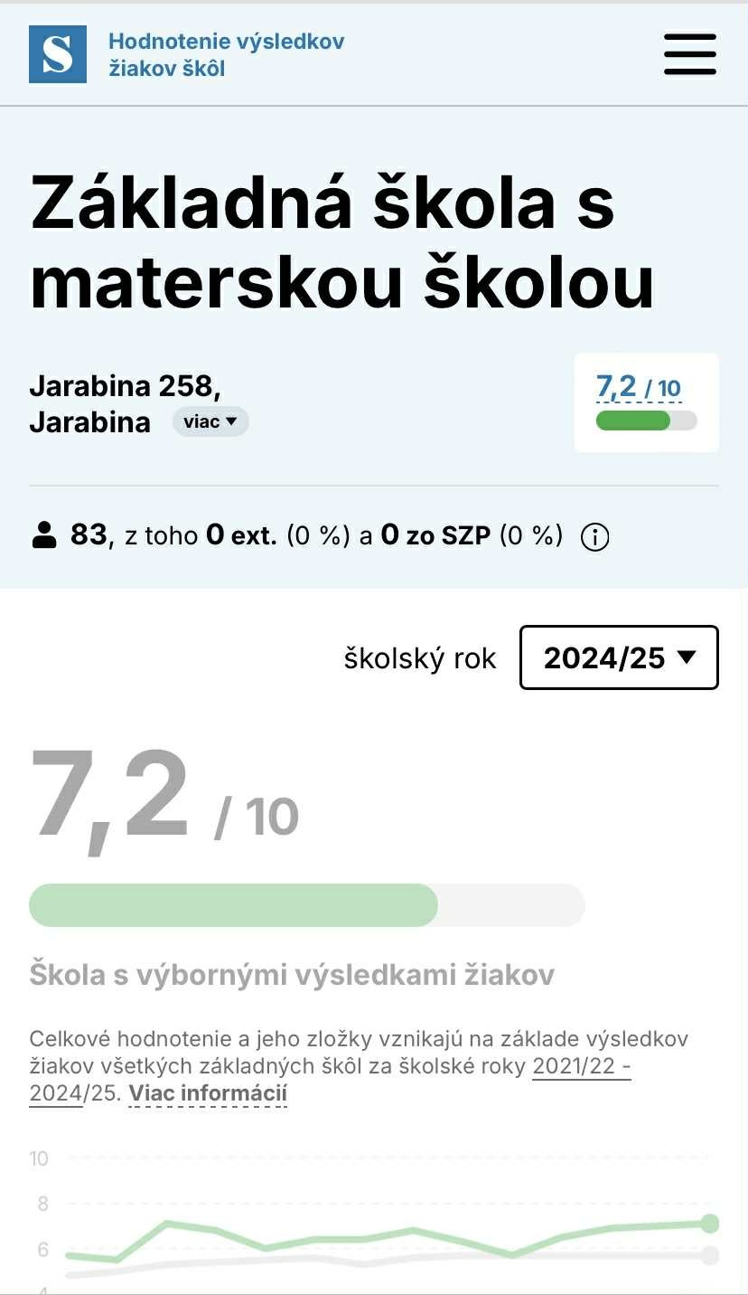 Ineko - hodnotenie škôl poskytuje rebríčky základných a stredných škôl na Slovensku, založené na výsledkoch žiakov za posledné 4 roky (testovanie, súťaže, mimoriadne výsledky žiakov). V hodnotení na škále od 0 - 10 naša škola získala 7,2 / 10. Bola ohodnotená ako škola s výbornými výsledkami žiakov. ![]()